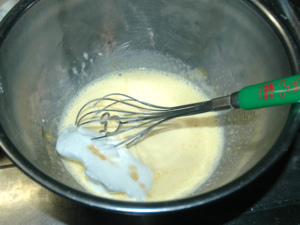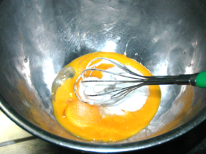 ②卵黄のボールに砂糖を加えて泡立て、白っぽくとろりとするまで泡だてます。