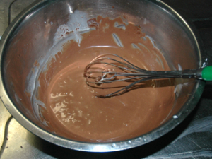 ⑭チョコを細かく刻んでボールに入れ、沸騰寸前まで温めた生クリームを加え、手早く混ぜて溶かします。