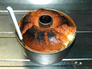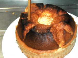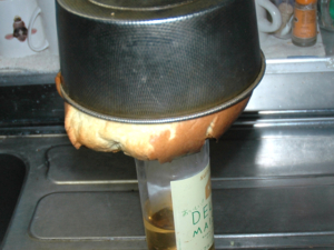 ⑪ケーキが焼けたら、すぐに逆さにして、瓶などに挿し、このまま2時間以上放置します。