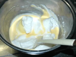 ⑦卵黄のボールにメレンゲを加え、ゴムべらに持ち替えて、さっくりと練らないように混ぜます。