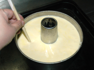 ⑨箸をケーキ内で、くるくる回しながら一周させ、中の気泡も取り除きましょう。