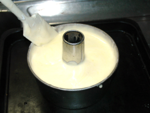 ⑧型に生地を流しいれ、筒部分を押さえて、二回ほどトントン落として空気を抜きます。