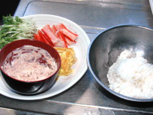 ![]() ①卵と砂糖を良く混ぜ、卵焼きを作り、縦長に切り、貝割れは根元を切ります。 ②ツナは、汁気を切ってから、マヨネーズを合わせておきます。 ③かにかまは袋から出しておきましょう。 |