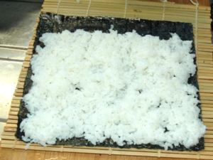 ![]() ④海苔を巻きすの上に乗せ、ご飯を250g乗せたら、上に2cmほど残し、四隅をきっちりと敷きつめます。 (四隅を綺麗に敷きつめると、仕上がりが綺麗になります。) |