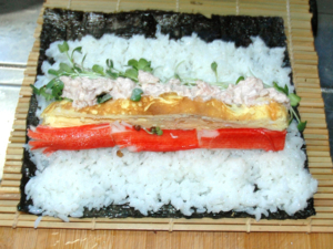 ![]() ⑤やや手前に、卵焼き、かにかま、貝割れ、ツナマヨが太い棒状になるように乗せます。 ⑥海苔の一番下が、巻きすの端に来るように移動させましょう。 |