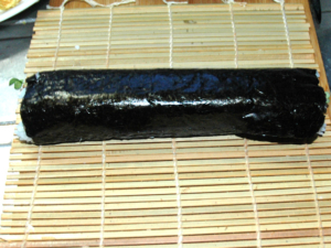 寿司飯を巻く時には、海苔と巻きすの一番下を合わせることが大事です。