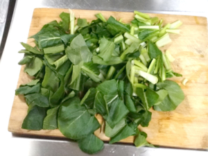 ![]() ①小松菜は根元を落とし、5cm長さに切ります。 |