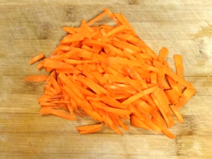 ![]() ⑥人参がしんなりしたら、合わせておいた調味料と小松菜を加え、中火にして、小松菜がしんなりするまで火を通します。 (30秒から40秒くらいでOKです。) |