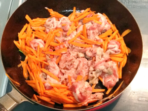![]() ④フライパンに薄く油(分量外)を引き、人参と豚こまを先に弱火で炒めます。 (弱火で炒めた方が肉がくっつきにくいです。) |