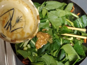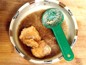 ![]() ⑤容器に、味噌、みりん、醤油、砂糖、白すりごまを入れ、良く混ぜ合わせておきましょう。 |