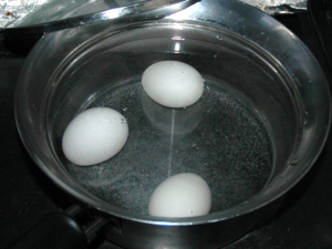 ![]() ①卵の尖って無い方に画鋲で穴をあけ、水からゆで、沸騰したら、12分ほど茹でて固ゆでのゆで卵を作ります。 |