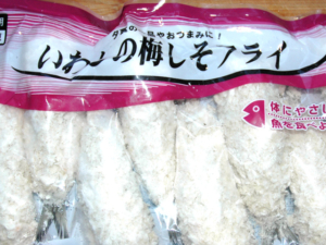 ![]() ③いわしの梅しそフライを用意します。 (冷凍タイプを使いました。) |