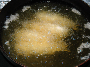 ![]() ④170度くらいの油でフライをきつね色になるまで揚げましょう。 |