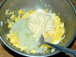 ![]() ⑥卵のボールに、玉ねぎ、マヨネーズ、酢小1(分量外)を加え、良く混ぜてタルタルソースを作りましょう。 |