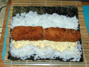 ![]() ⑦海苔の上2cmほど残して、酢飯を250g乗せて、平らに広げます。 ⑧手前にタルタルソースの1/4量を塗り、上に揚げたフライを乗せましょう。 (フライは細い部分を切って合わせます。) |