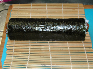 巻く時には、海苔とご飯の境目まで一気に巻くと、綺麗に巻けます。