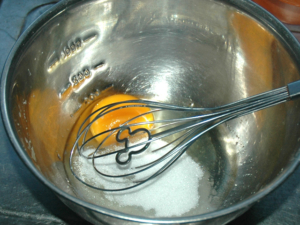 ![]() ①ボールに卵と砂糖を入れ、砂糖のザラザラ感がなくなるまでしっかりと混ぜます。 |