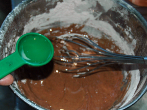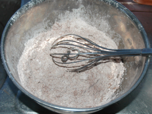 ![]() ③薄力粉とココア、ベーキングパウダーを合わせて振るい入れ、粉っぽさが無くなるまで混ぜます。 |