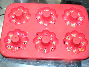 ![]() ⑦ドーナツ型にチョコスプレーを散らし、デコレーションしておきましょう。 (ナッツでもドライフルーツでもお好きなものを。) |