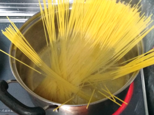 ![]() ①鍋にたっぷりのお湯を沸かし、沸いたら塩を大1/2(分量外)ほど入れてから、パスタをパッケージの時間通りにゆでます。 |
