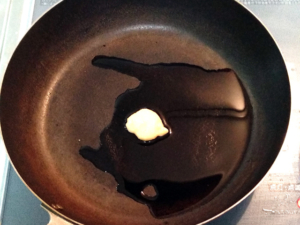 ![]() ②フライパンにオリーブオイルを引き、にんにくも加えて、弱火で炒めて香りを出します。 |