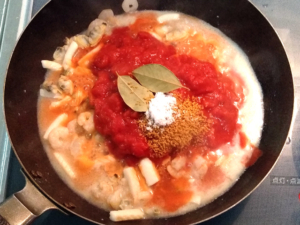 ![]() ⑤軽くワインの水気を飛ばしたら、トマト、ローリエ、砂糖、コンソメ、黒コショウを入れて混ぜましょう。 |