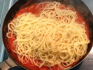 冷凍のシーフードミックスがあったので、同じく家にあったトマト缶と一緒に、ペスカトーレ風のパスタにしてみました。トマトベースのパスタも、缶詰で楽々調理です。