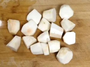 ![]() ①里芋は皮をむき、それぞれ2等分します。 |