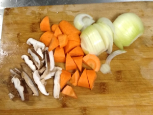 ![]() ②玉ねぎは皮をむき、薄切りに、人参は皮をむき、小さめの乱切りに、椎茸は軸を取り、薄切りにします。 |