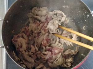 ![]() ③鍋に薄く油(分量外)を引き、豚肉の色が白くなるまで炒めましょう。 |