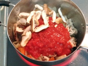![]() ⑤トマト缶と椎茸も鍋に加え、良く混ぜ合わせたら、一旦煮立たせましょう。 |