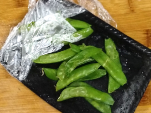 ![]() ⑦さやいんげんは、筋を取り除き、耐熱容器に入れてラップをし、レンジで1分半ほど加熱します。 ⑧すぐに冷水に取り、色止めをしておきましょう。 |