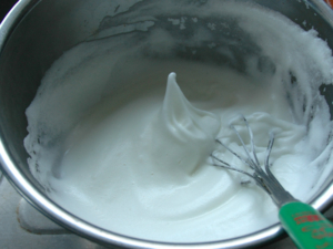 ![]() ①卵白のボールに砂糖をひとつまみ加えて泡立て始め、クリーム状の硬さになったら、二回に分けて砂糖を加えて泡立て、ピンと角が立つまで泡立てます。 |