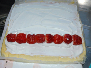 ![]() ⑪生地をシートからゆっくり丁寧に剥がし、クリームを平らに塗ります。 ⑫手前を少しクリームを多くして、その上に両端をカットした苺を並べたら、苺の上にも少しクリームを乗せましょう。 |