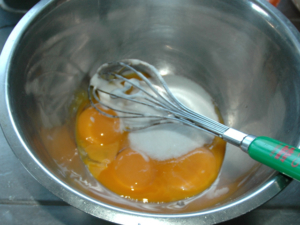 ![]() ②卵黄のボールに残りの砂糖の全量を加え、白っぽく持ったりとして、少し跡がつくまでしっかりと泡立てます。 |