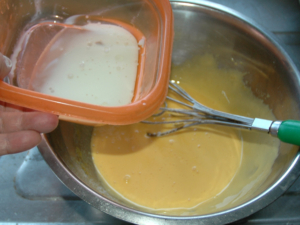 ![]() ③牛乳と油の混合液をレンジで20秒ほど加熱し、人肌になったら、卵黄のボールに少しずつ加え、その都度良く混ぜましょう。 ④卵黄のボールにメレンゲを少量加え、良く混ぜ合わせます。 |