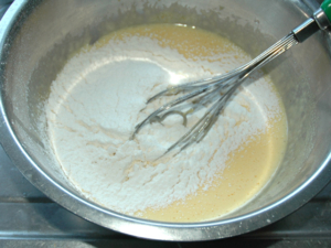 ![]() ⑤卵黄のボールに薄力粉をふるい入れ、粉っぽさがなくなるまで混ぜます。 |