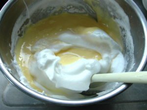 ![]() ⑥卵黄のボールの中身を全て卵白のボールに移し、ゴムべらに持ち替えて、さっくりと練らないように混ぜましょう。 |
