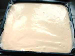 ![]() ⑦天板に薄く油を塗って、オーブンシートを敷いたら、生地を流し入れ、平らにならします。 ⑧上からトントン落として大きな気泡を取り除きましょう。 |