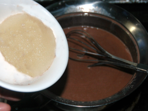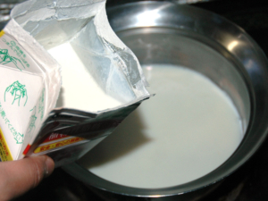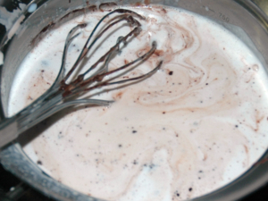 ![]() ⑤牛乳の入った鍋に、お湯で混ぜたココアを加え、良く混ぜ合わせます。 |