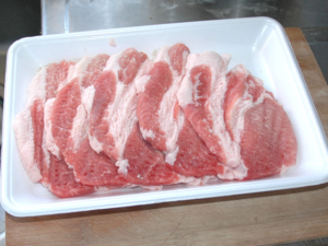 ![]() ①豚肉は身と脂の境目に垂直に包丁を入れ、筋切をしておきます。 (今回は、すでに筋切りをしてある肉を使います。) |