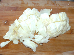 ![]() ④キャベツは小さめのざく切りにします。 |
