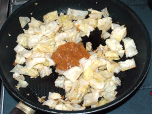 ![]() ⑦みそだれの半量をキャベツに加え、全体に味を絡めてから、一旦取り出します。 |