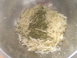 ![]() ①まず、中に入れる抹茶チョコガナッシュから作ります。 ②ボールに★抹茶チョコガナッシュのホワイトチョコを細かく均一に刻んで入れ、抹茶も加えましょう。 |