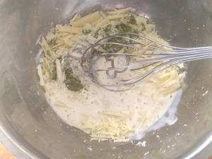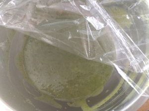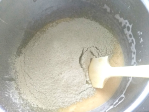 ![]() ③小鍋で沸騰寸前まで温めた生クリームをチョコに回しかけ、手早く混ぜてチョコと抹茶をしっかりと溶かします。 |