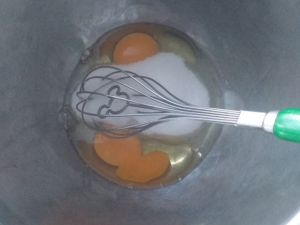 ![]() ⑤ガナッシュが冷えたら、チョコケーキ生地を作ります。 ⑥ボールに卵白と卵黄、グラニュー糖を入れ、泡立て始めます。 |