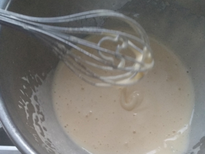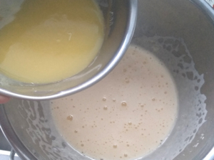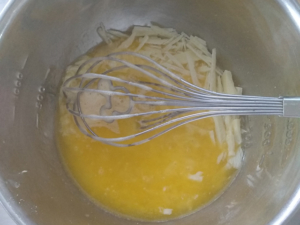 ![]() ⑩チョコが溶けたら、卵のボールに4回ほどに分けて入れ、その都度良く混ぜます。 (泡だて器を垂直に立てて混ぜると、練らないで混ぜれます。) |