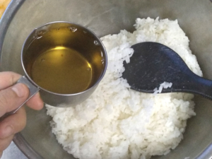 ![]() ①ご飯に寿司酢を混ぜ、へらで切るように混ぜて酢飯を作り、冷ましておきます。 |