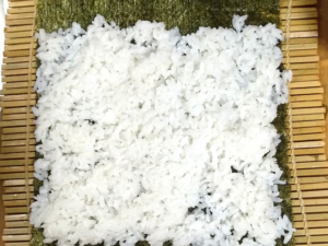 ![]() ④海苔を巻きすの上に乗せ、ご飯を250g乗せたら、上に2cmほど残し、四隅をきっちりと敷きつめます。 (四隅を綺麗に敷きつめると、仕上がりが綺麗になります。) |