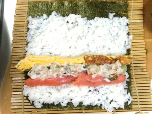 ![]() ⑤やや手前に、きゅうり、卵焼き、たらこ、わさび漬けを乗せます。 ⑥海苔の一番下が、巻きすの端に来るように移動させましょう。 |